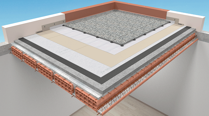 Sistema di tenuta all’acqua costituito da manto sintetico in PVC o TPO protetto con quadrotti in cls o similari posati su idonei supporti.