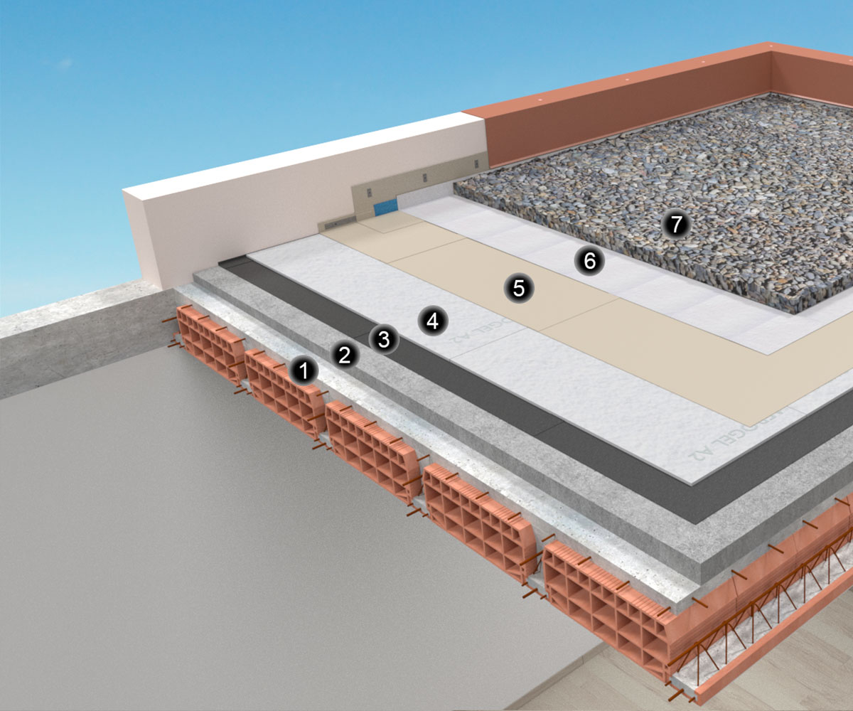 Strato isolante realizzato in AEROGEL A2 posato sopra barriera al vapore e impermeabilizzazione costituita da manto sintetico in PVC o TPO rivestito con ghiaino lavato distribuito sopra strato filtrante di protezione in TNT.